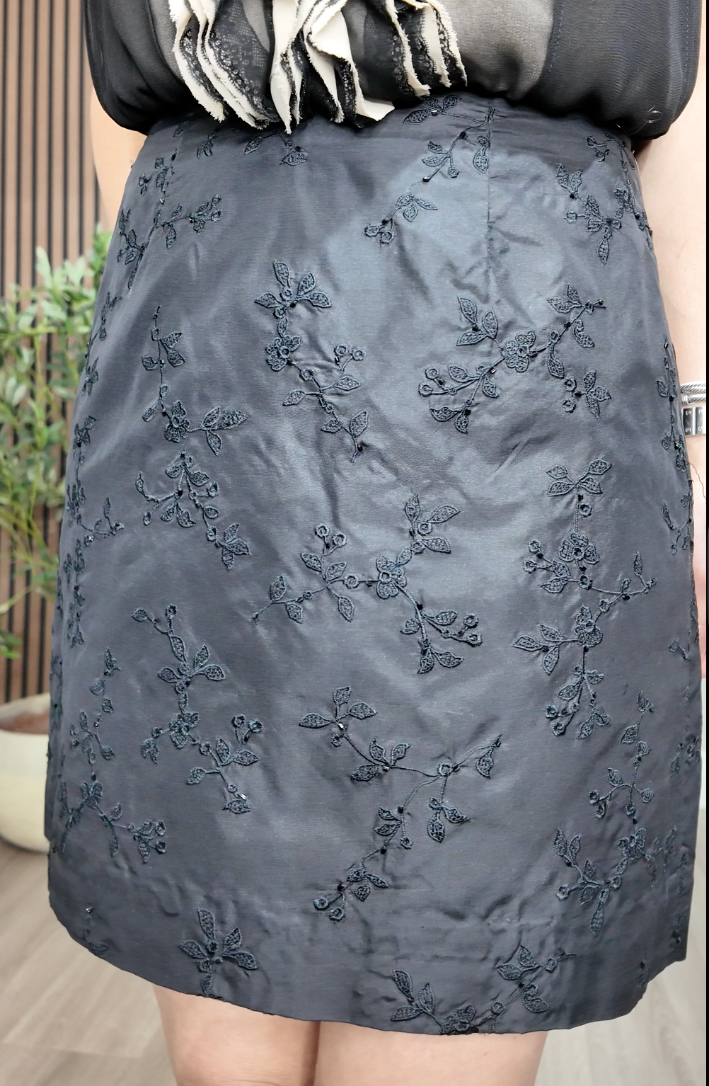 Elegant mini skirt crafted in 100% silk, featuring delicate tonal floral embroidery that adds subtle texture and sophistication. Designed with a clean, structured silhouette that flatters the figure while maintaining a timeless and feminine look.