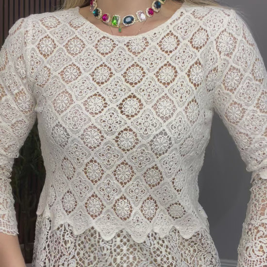 Elegant beige lace blouse featuring an intricate all-over lace design with a soft, feminine finish. Designed with classic 3/4 sleeves, a round neckline, and a scalloped hem that adds a delicate touch. Lightweight and refined, perfect to style with tailored pants, skirts, or denim for a chic day-to-evening look.