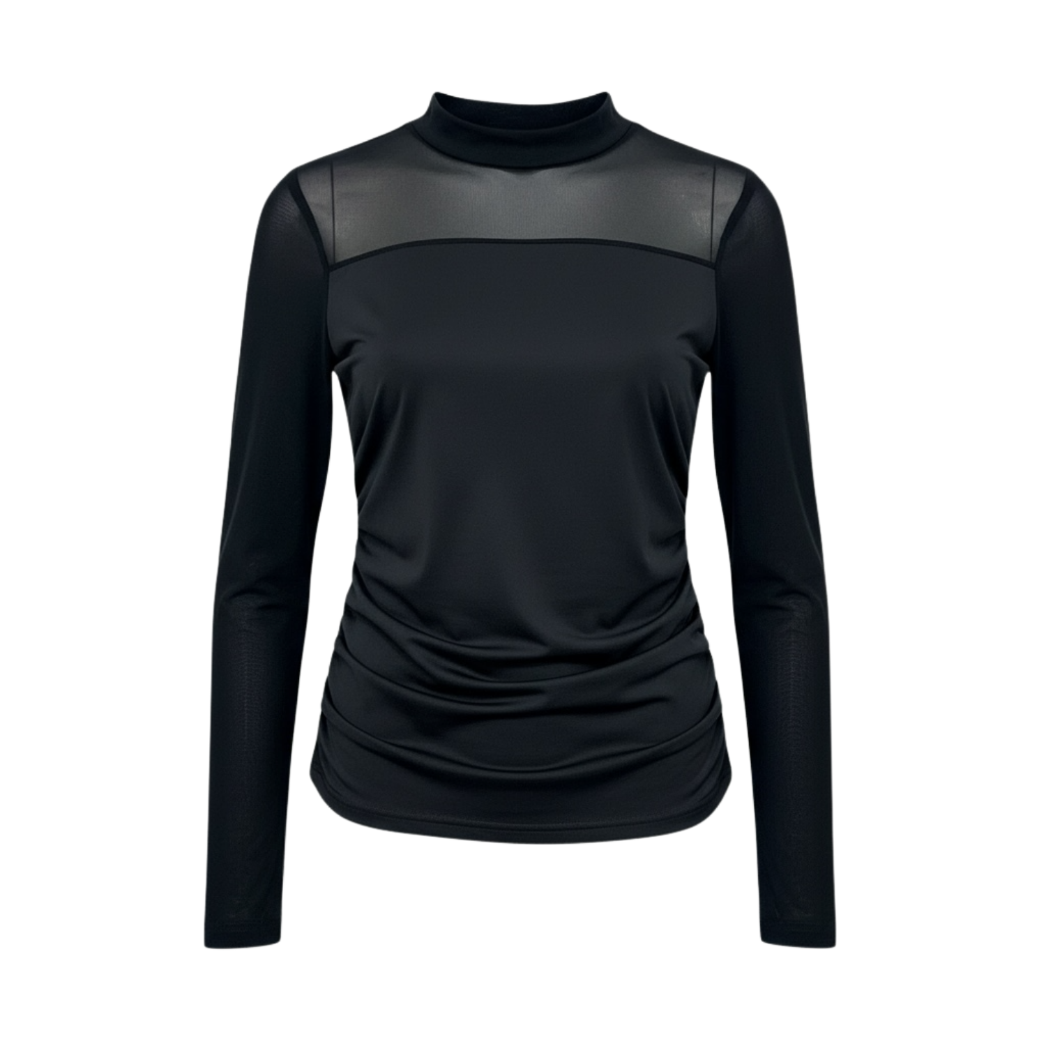 Sleek and sophisticated long sleeve top featuring sheer mesh panels across the neckline and sleeves for a subtle, elegant contrast. Designed with a high neckline and softly ruched waist that enhances the silhouette. Crafted from smooth, stretchy fabric, this piece offers comfort while delivering a modern, chic look perfect for day-to-night styling.