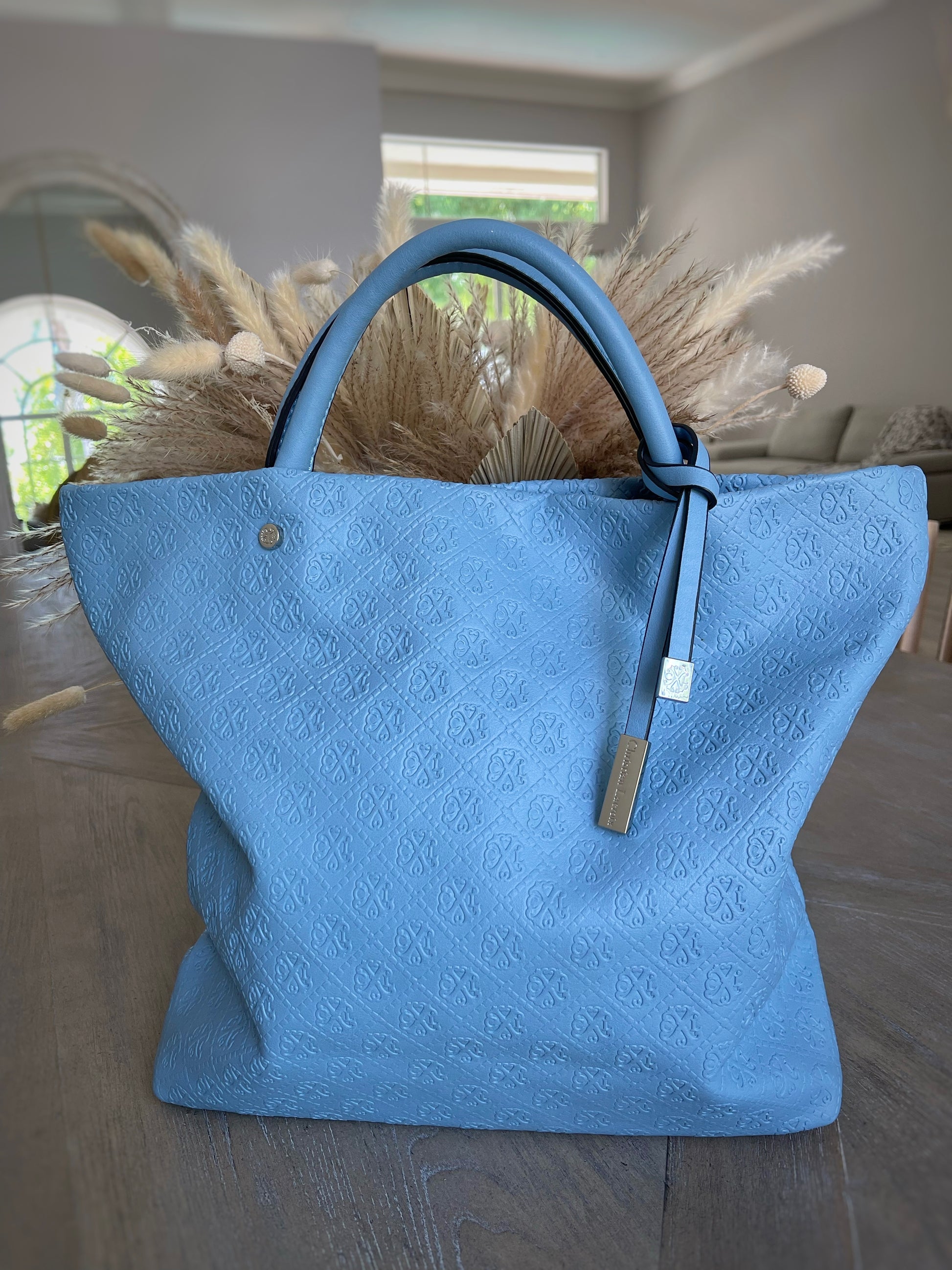 Bolso tipo Tote azul baby, grabado, marca Christian Lacroix en optimas condiciones
