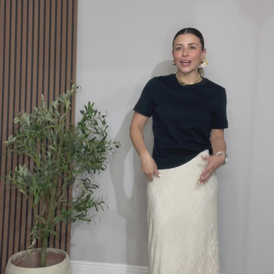 Designed with a classic crew neckline and short sleeves, this versatile piece is perfect for layering or wearing on its own. Easy to dress up or down, it pairs effortlessly with skirts, jeans, or tailored pants for a chic everyday outfit.