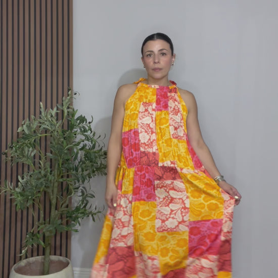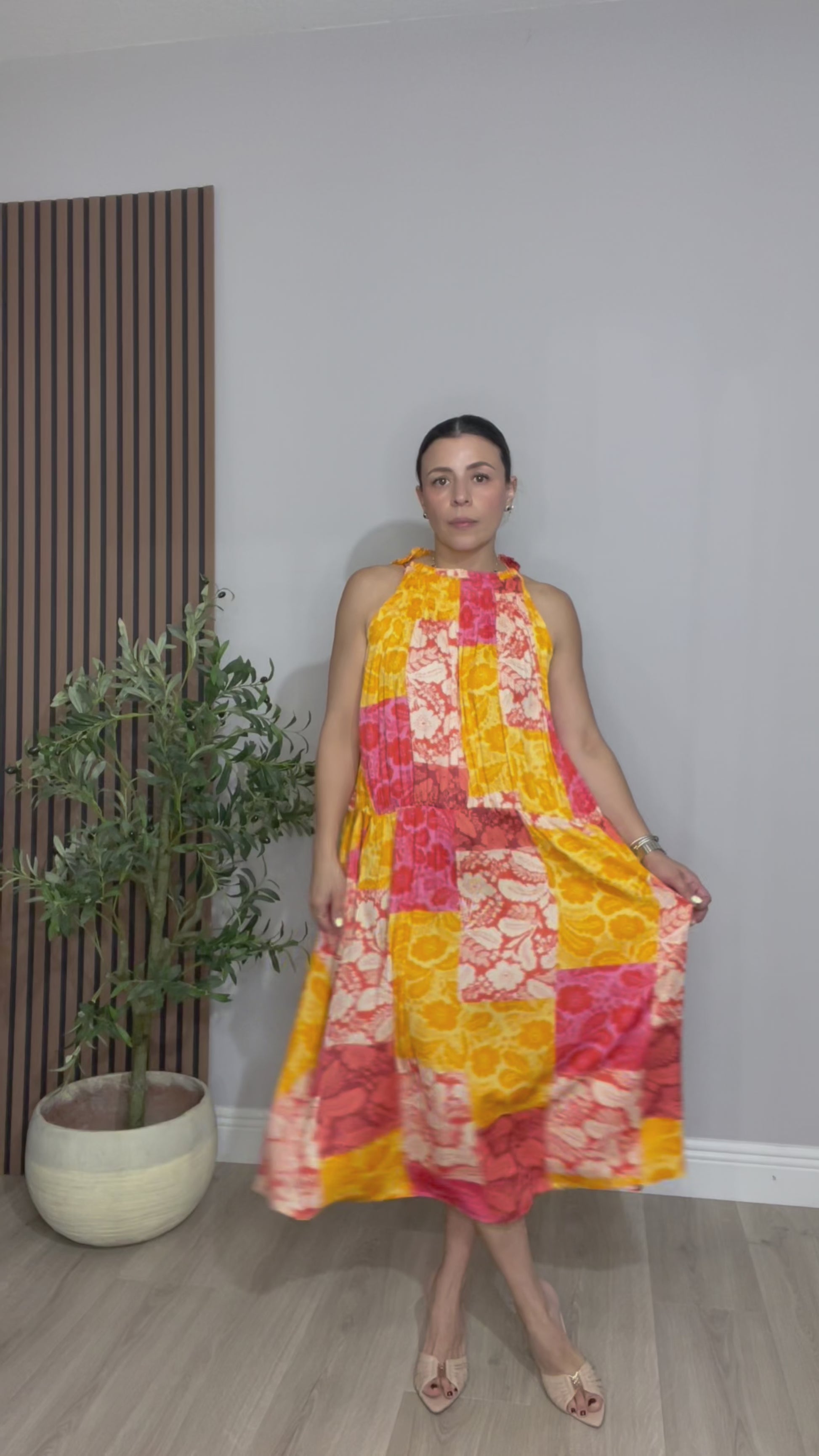 Vibrant and feminine, this beautiful midi dress by Ann Taylor features a flattering halter neckline and a flowy A-line silhouette. Designed with a colorful patchwork-inspired floral print in warm tones of yellow, coral, and pink, it brings a fresh and cheerful touch to any look. The lightweight fabric offers comfort and movement, making it perfect for warm days, vacations, brunch, or casual events.