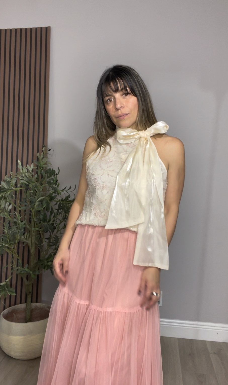 This ethereal sleeveless top in a delicate ivory hue features intricate floral embroidery with subtle pink accents throughout the bodice. The standout design element is a luxurious, oversized satin-finish bow that ties at the side of the high halter neckline, creating a sophisticated and romantic focal point. The mix of textured floral details and the lustrous, flowing fabric of the bow gives this piece a high-fashion, feminine appeal.