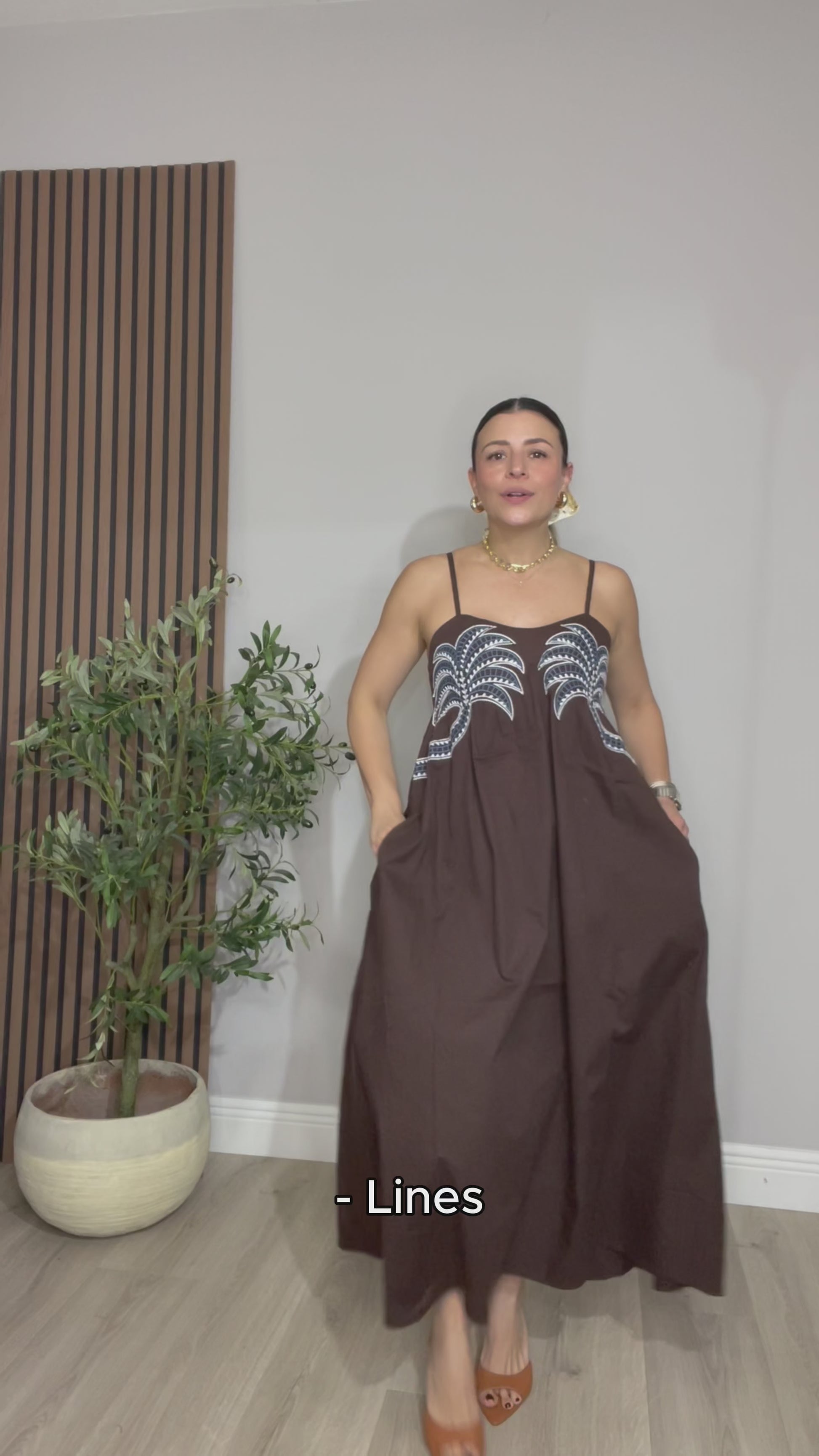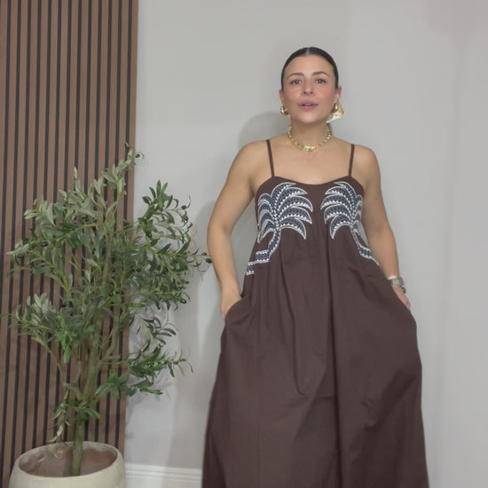 This beautiful brown midi dress features delicate embroidered detailing on the front, adding a unique and elegant touch. Designed with thin adjustable straps and a relaxed, flowy silhouette, it offers both comfort and effortless style.
