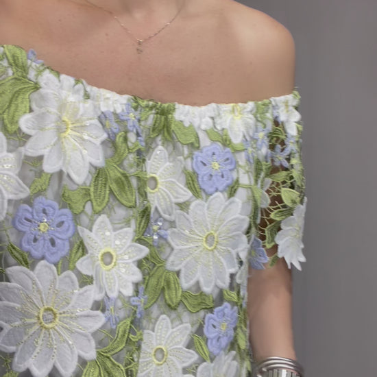 Romantic off-the-shoulder blouse featuring intricate 3D floral embroidery in soft white, green, and delicate hints of blue. Designed with a sheer lace base and beautifully detailed daisy appliqués that create texture and dimension throughout.