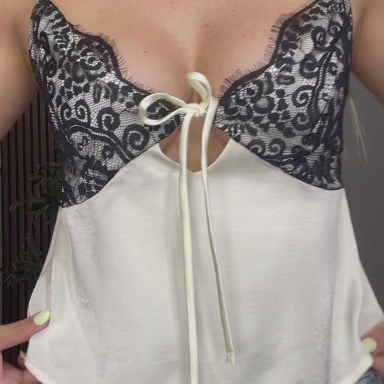 Sleeveless top featuring delicate black lace detailing on the bust with a contrasting ivory and brown base. Designed with thin adjustable straps, a subtle front tie, and a softly flared silhouette that adds movement and femininity. Lightweight and comfortable, perfect to style with jeans or tailored pants for a chic day-to-night look.
