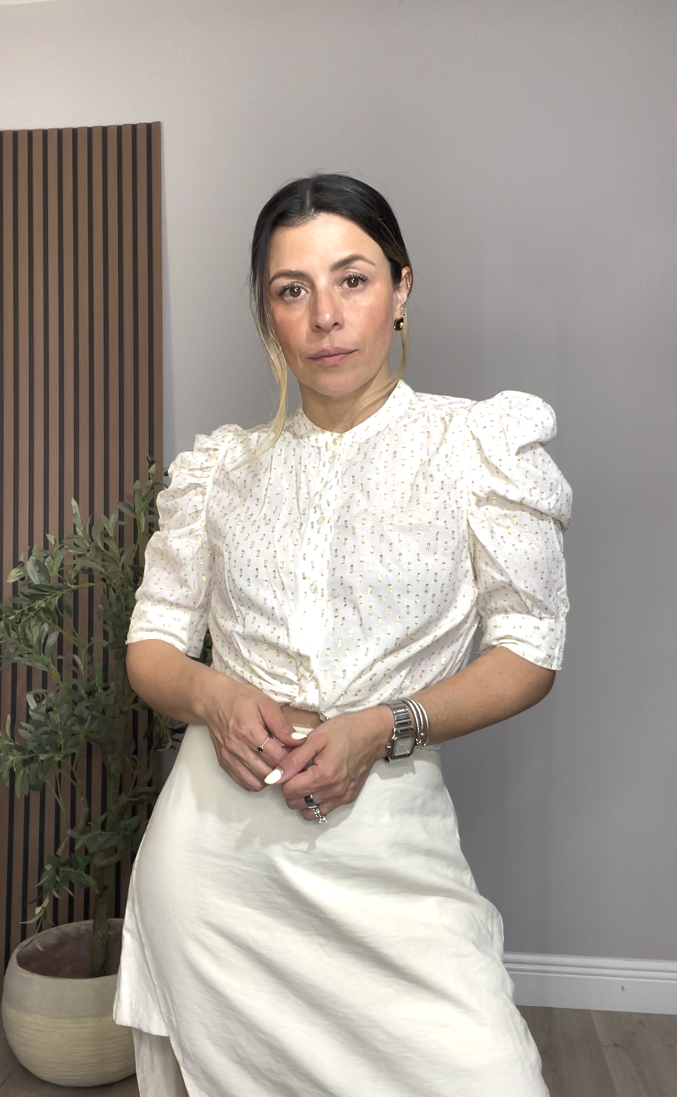 Elegant ivory blouse featuring delicate gold metallic dotted detailing throughout. Designed with statement puff sleeves, a high neckline, and front button closure for a refined, feminine silhouette. Soft pleating at the front adds subtle texture and sophistication. Perfect to pair with skirts or tailored pants for a polished day-to-night look.