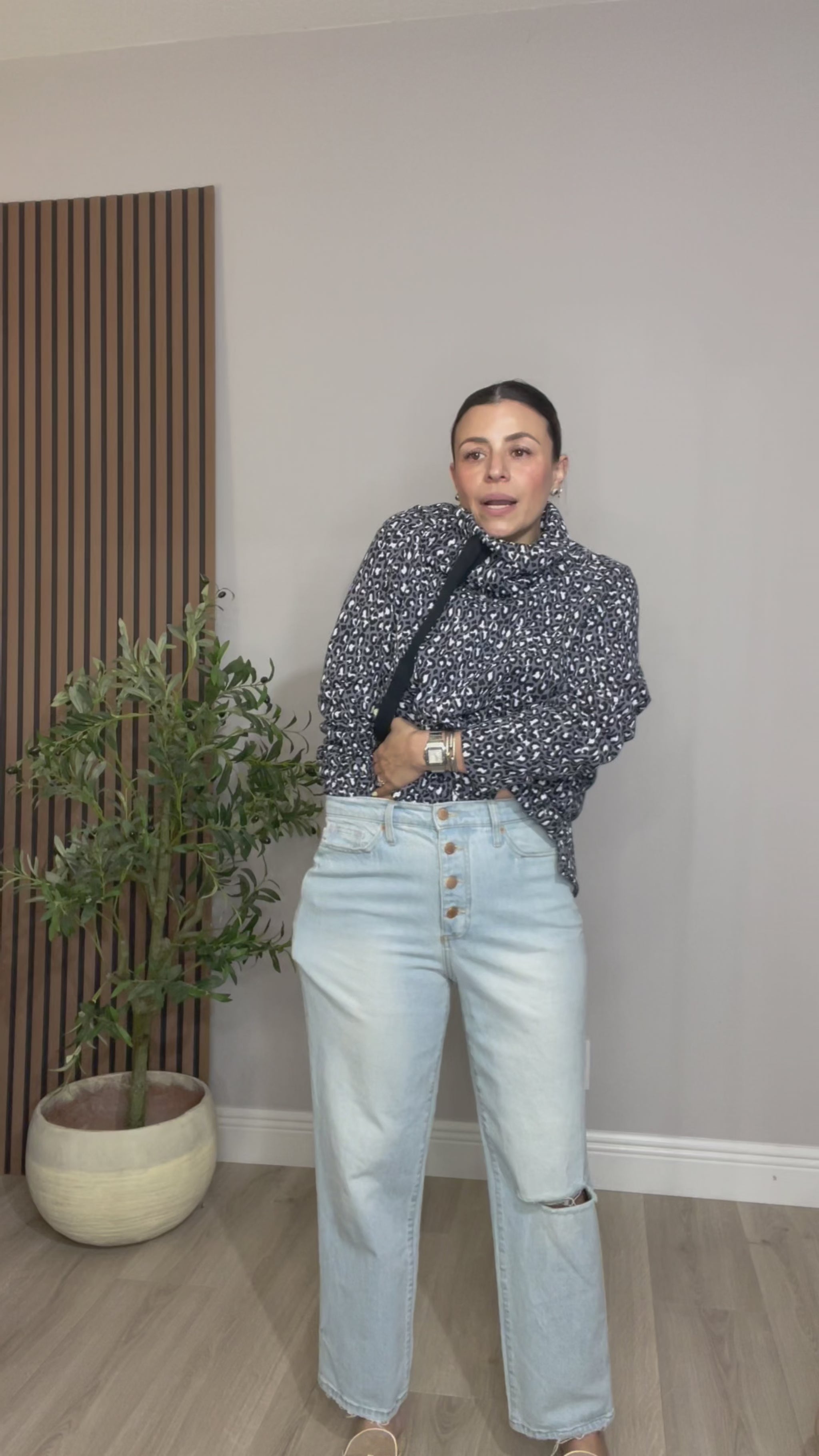 These stylish light-wash jeans feature a flattering high-rise waist with a button-front closure for a modern, vintage-inspired look. Designed with a straight-leg fit, they offer comfort and versatility for everyday wear. The distressed knee detail adds a trendy, casual touch, making them perfect to pair with sweaters, blouses, or basic tees. A timeless wardrobe essential for effortless styling.
