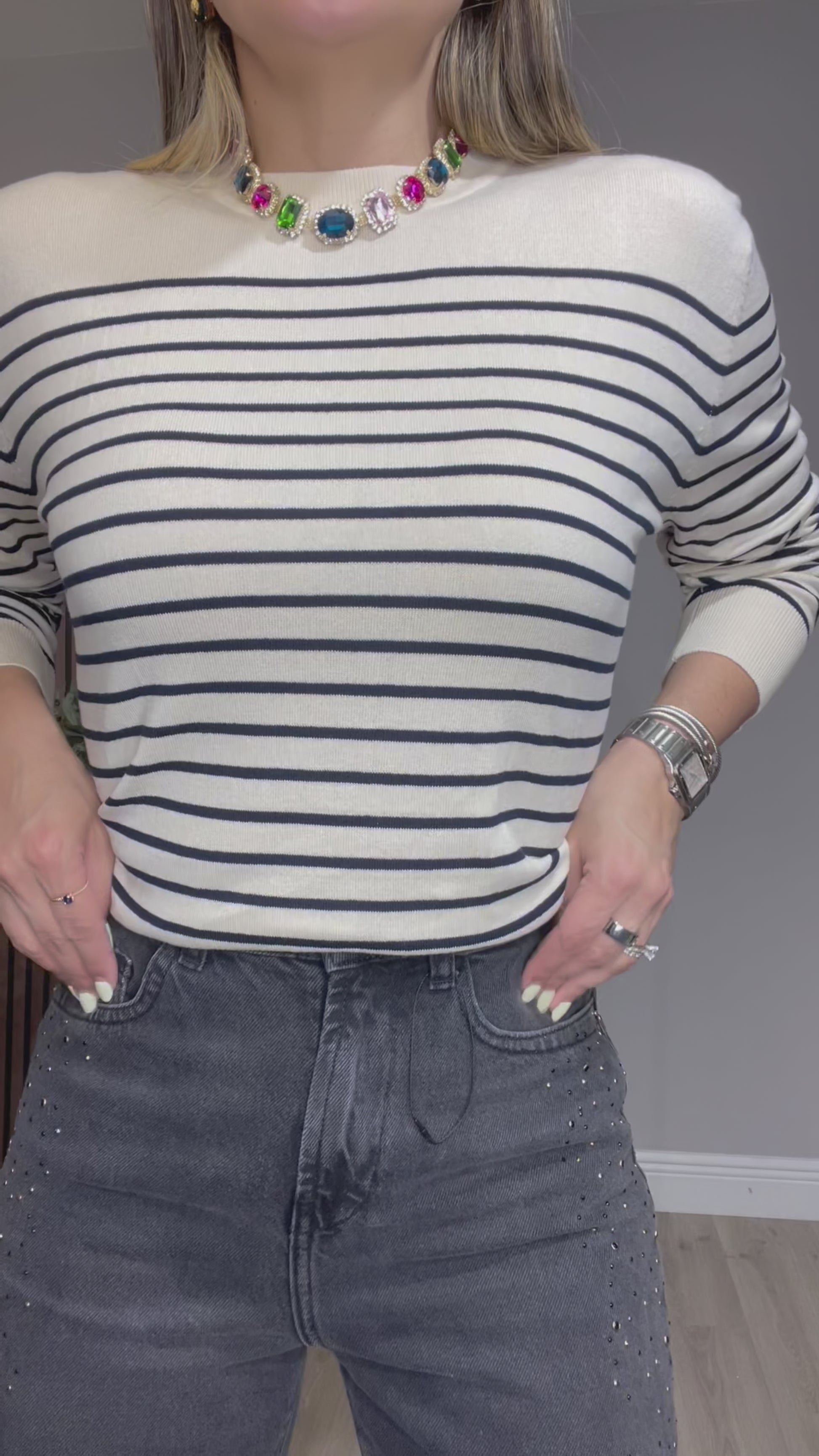 The standout detail? Subtle scattered embellishments in black and gold tones along the front, adding a refined sparkle that catches the light beautifully without overpowering the look.