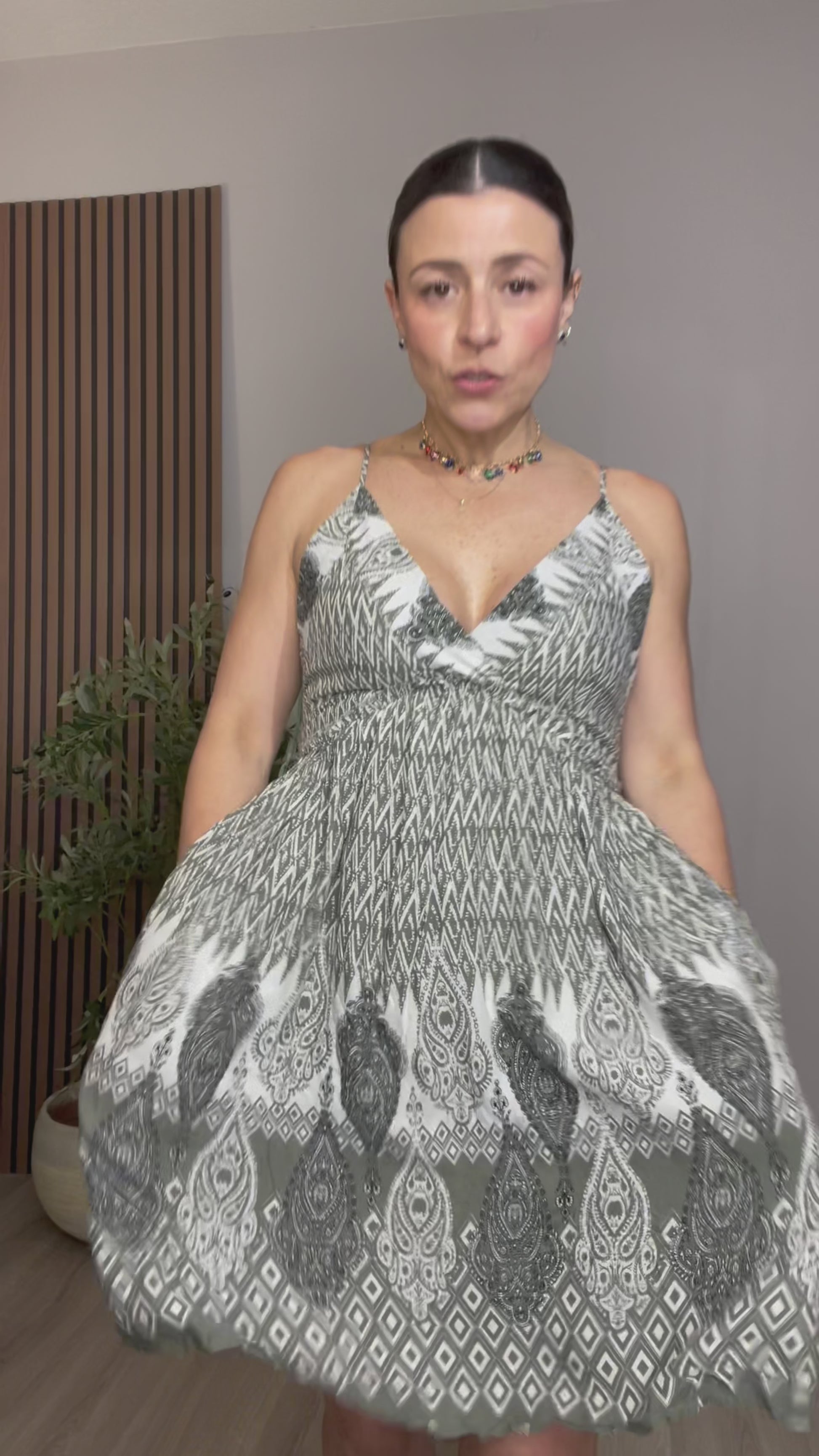 This elegant olive green dress features a flattering V-neckline and delicate spaghetti straps for a feminine, lightweight feel. Designed with a fitted bodice and a flowy skirt, it creates a beautiful silhouette that enhances natural curves. The intricate ethnic-inspired print adds a boho-chic touch, making it perfect for casual outings, vacations, or daytime events. Crafted from soft, breathable fabric, this dress offers both comfort and style. Pair it with sandals or wedges for an effortlessly polished look.