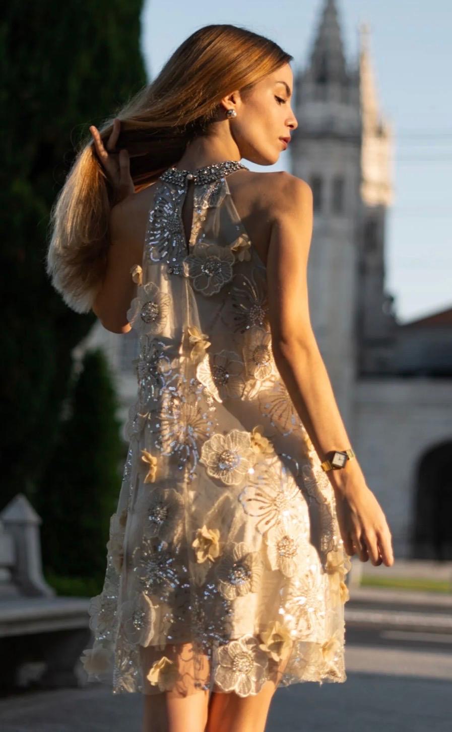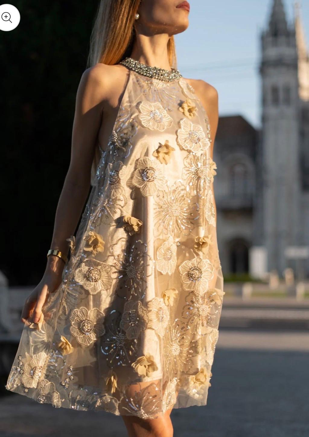 Exude ethereal elegance with this breathtaking midi dress from Rich Radi QS. This piece is a true work of art, blending delicate textures with opulent hand-applied details for a look that is purely romantic.