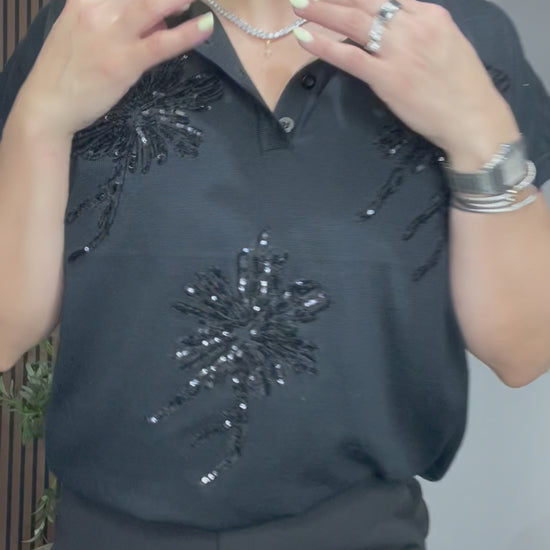 Chic black knit polo-style blouse featuring a classic collar and short sleeves for a timeless silhouette. Elevated with stunning sequin palm tree embellishments that add texture, shine, and a subtle statement detail.