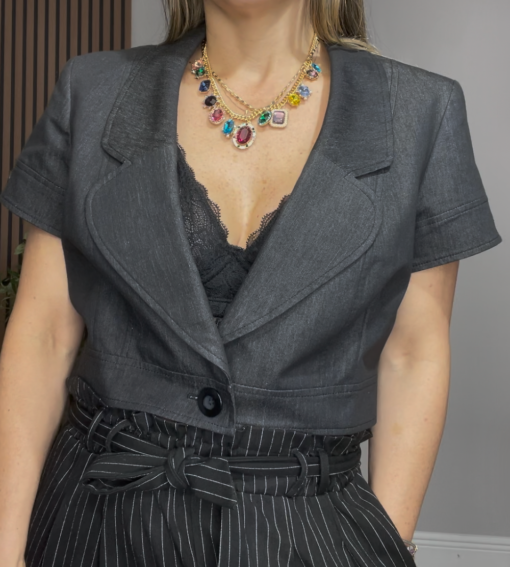 Chic charcoal-gray cropped blazer-style top featuring a structured silhouette with classic lapel collar and front button closure. Designed with short sleeves and a tailored fit that enhances the waist, creating a polished and modern look.