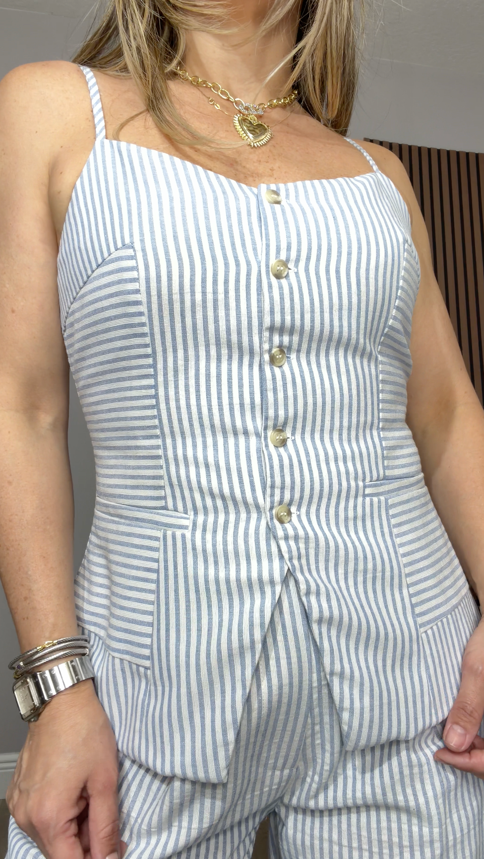 This two-piece set offers a fresh and feminine take on classic summer tailoring. Featuring a crisp vertical stripe pattern, it combines a structured silhouette with breathable style, making it ideal for garden parties, brunch, or an elevated daytime look.