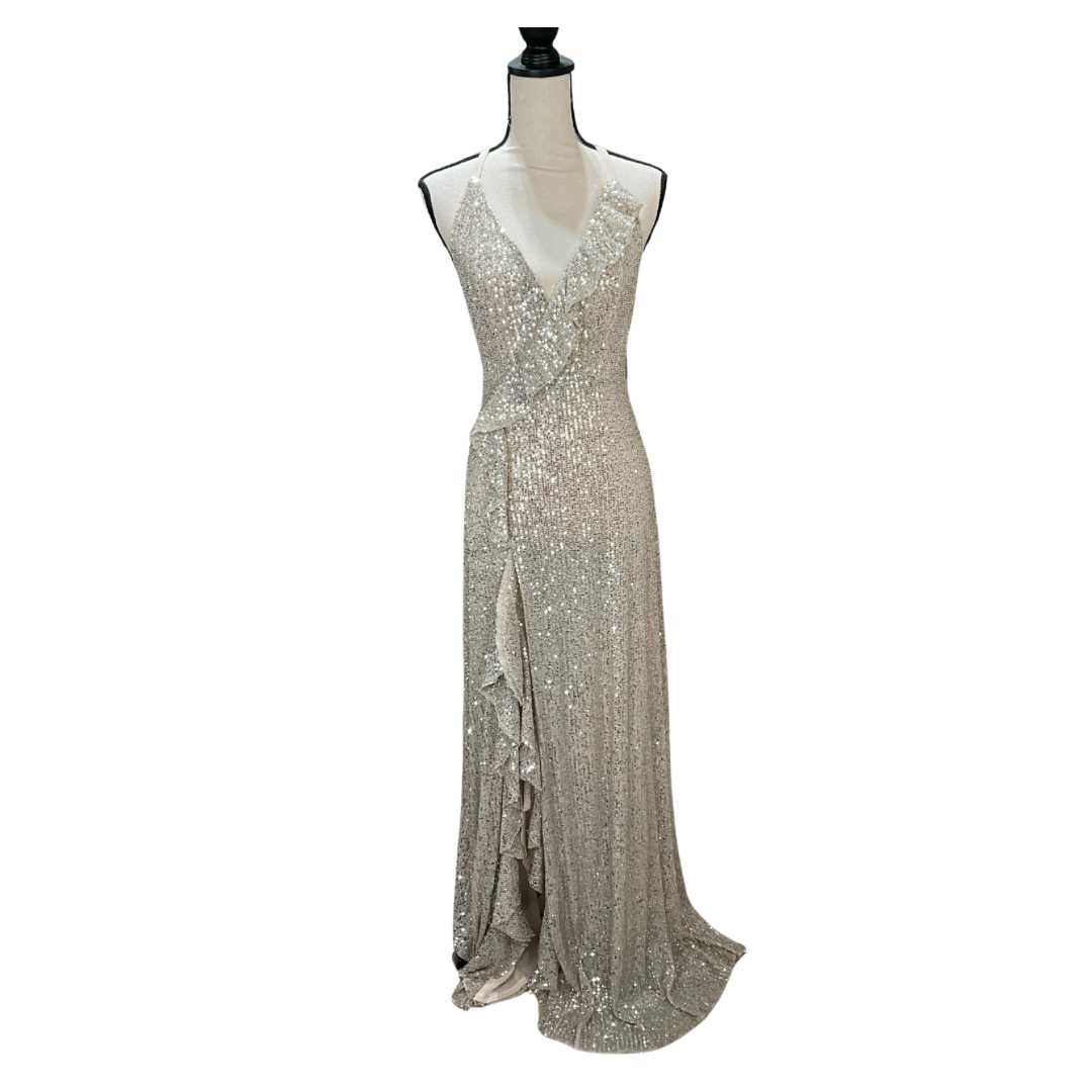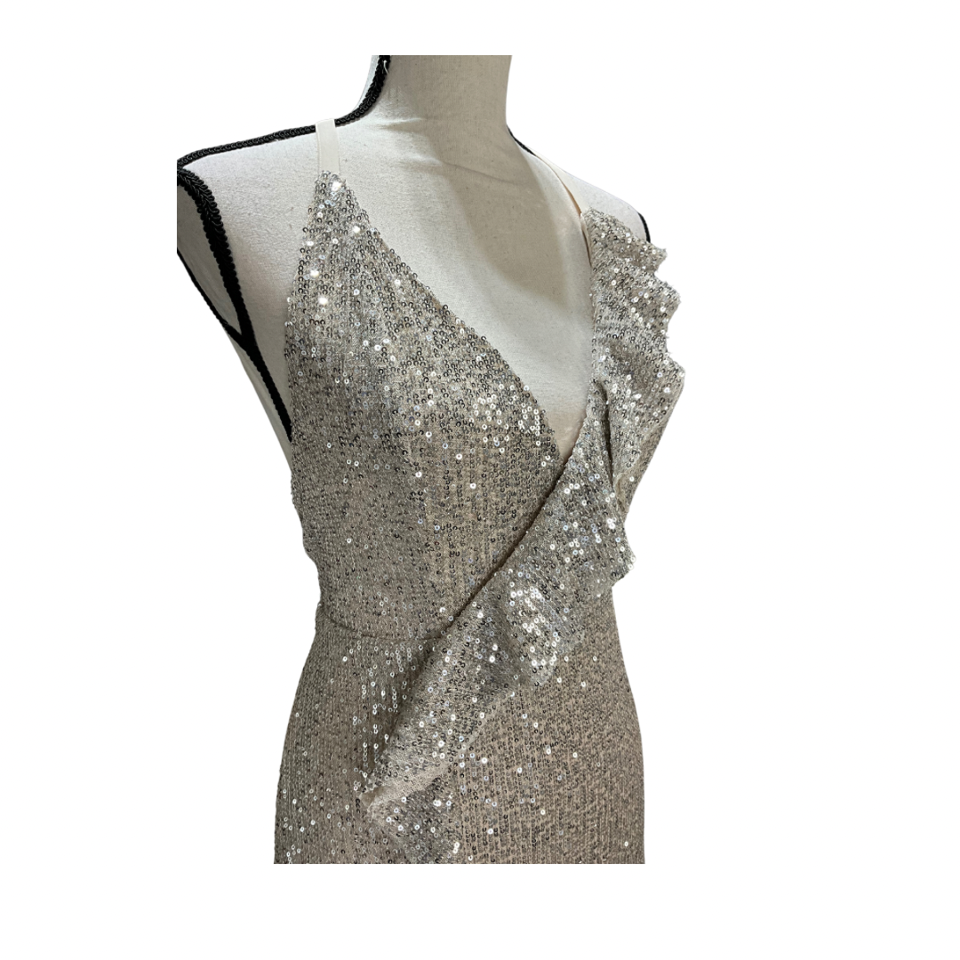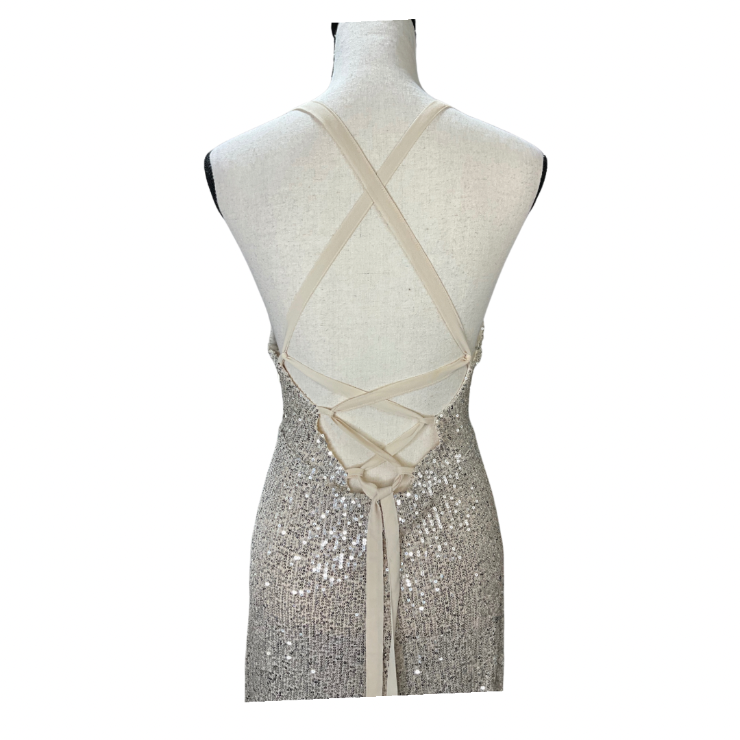 Vestido largo, color champagne con lentejuelas, corte en V, espalda con lazos en X, con abertura en pierna, marca LUXXEL.