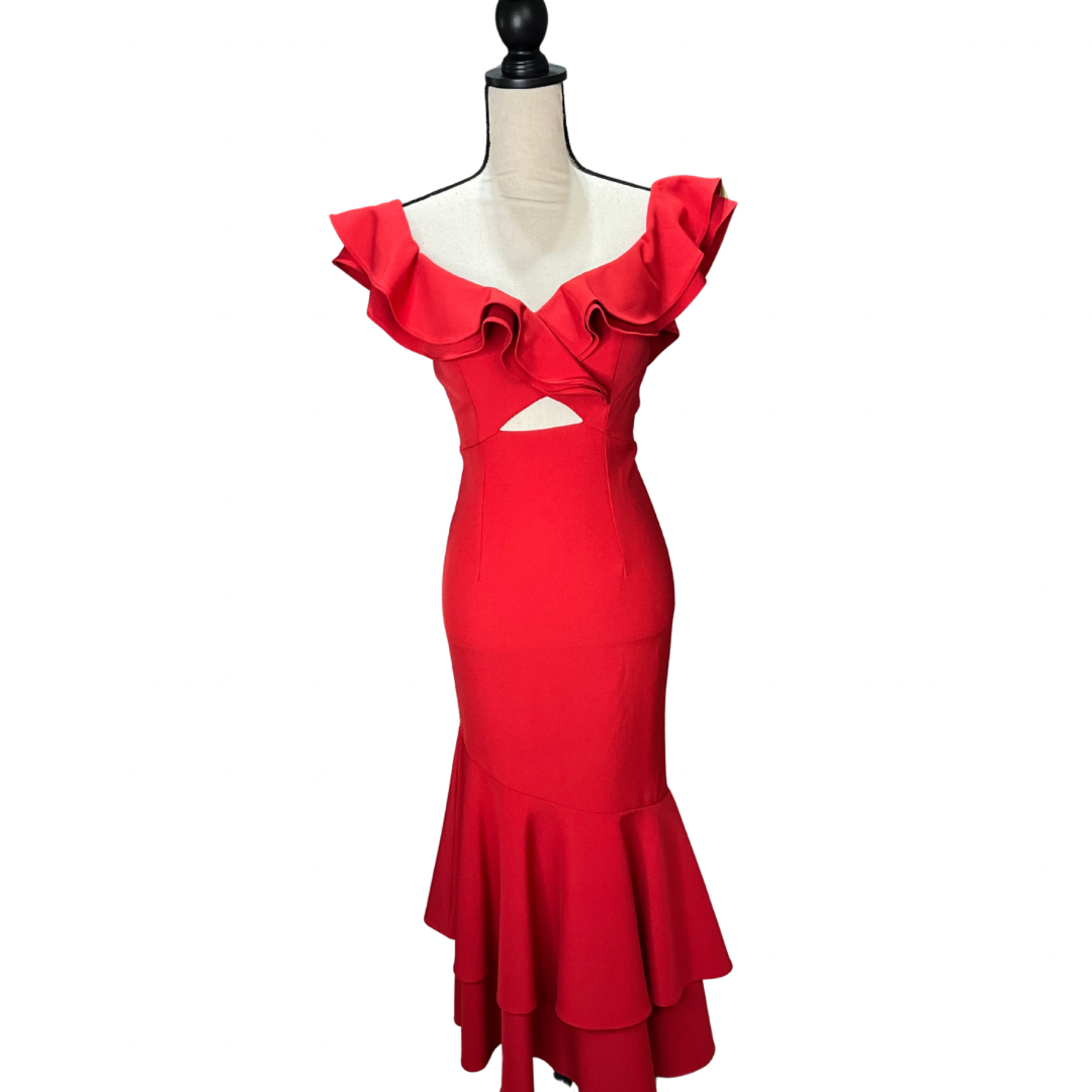 Vestido rojo largo, cuello tipo bandeja con boleros, marca Jarlo.